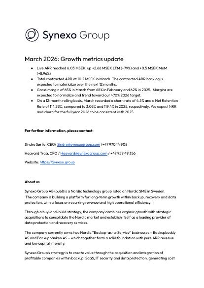 Synexo Group's strategy is to create value through the acquisition and integration of profitable companies within backup, SaaS, IT security and data protection, generating cost synergies across infrastructure, licenses and operations, and strengthening customer trust through Nordic data storage that ensures regulatory compliance, data sovereignty and high security.