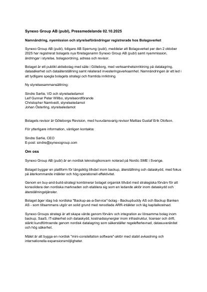 Synexo Group AB (publ), tidigare AB Sperrung (publ), meddelar att Bolagsverket per den 2 oktober 2025 har registrerat bolagets nya företagsnamn Synexo Group AB (publ) samt nyemmission, ändringar i styrelse, bolagsordning, adress och revisor.