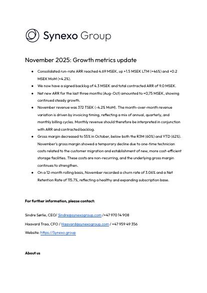 - Net new ARR for the last three months (Aug-Oct) amounted to +0,75 MSEK, showing continued steady growth.