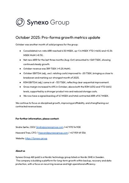 Synexo Group's strategy is to create value through the acquisition and integration of profitable companies within backup, SaaS, IT security and data protection, generating cost synergies across infrastructure, licenses and operations, and strengthening customer trust through Nordic data storage that ensures regulatory compliance, data sovereignty and high security.