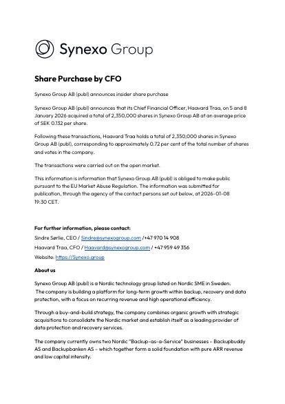 Synexo Group AB (publ) announces that its Chief Financial Officer, Haavard Traa, on 5 and 8 January 2026 acquired a total of 2,350,000 shares in Synexo Group AB at an average price of SEK 0.132 per share.