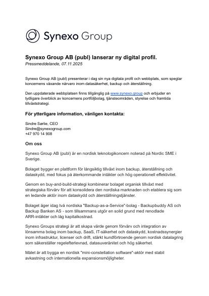 Synexo Group AB (publ) är en nordisk teknologikoncern noterad på Nordic SME i Sverige. Bolaget bygger en plattform för långsiktig tillväxt inom backup, återställning och dataskydd, med fokus på återkommande intäkter och hög operationell effektivitet.