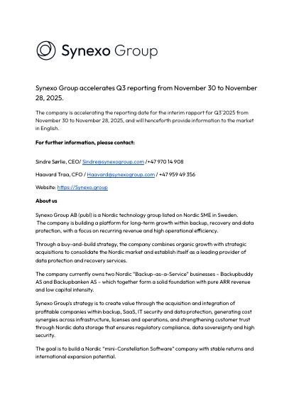 Synexo Group's strategy is to create value through the acquisition and integration of profitable companies within backup, SaaS, IT security and data protection, generating cost synergies across infrastructure, licenses and operations, and strengthening customer trust through Nordic data storage that ensures regulatory compliance, data sovereignty and high security.