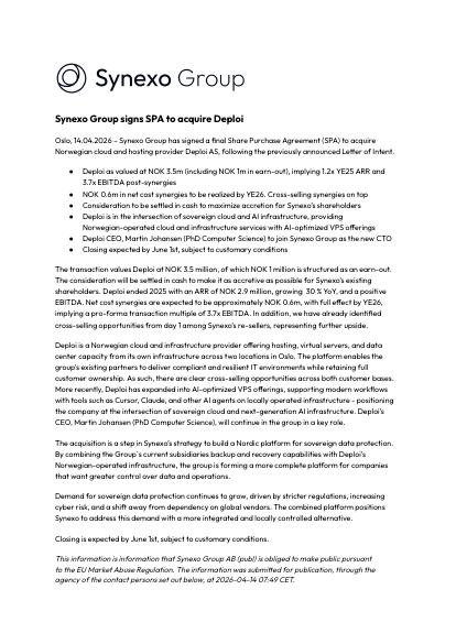 Oslo, 14.04.2026 - Synexo Group has signed a final Share Purchase Agreement (SPA) to acquire Norwegian cloud and hosting provider Deploi AS, following the previously announced Letter of Intent.