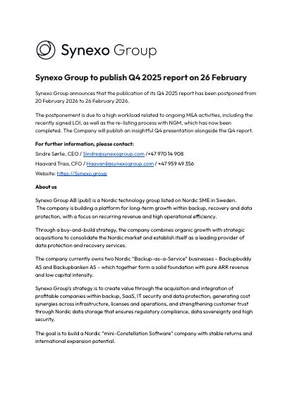 Synexo Group announces that the publication of its Q4 2025 report has been postponed from 20 February 2026 to 26 February 2026.