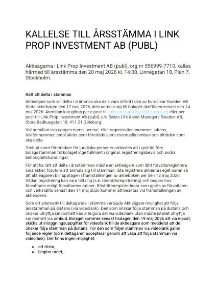 Aktieägarna i Link Prop Investment AB (publ), org.nr 556999-7710, kallas härmed till årsstämma den 20 maj 2026 kl. 14:00, Linnégatan 18, Plan 7, Stockholm.