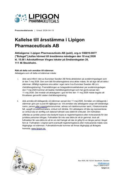 Aktieägarna i Lipigon Pharmaceuticals AB (publ), org.nr 556810-9077 ("Bolaget"), kallas härmed till årsstämma måndagen den 18 maj 2026 kl. 15.00 i Advokatfirman Vinges lokaler på Smålandsgatan 20, 111 46 Stockholm.