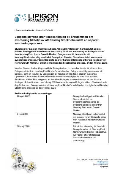 Styrelsen för Lipigon Pharmaceuticals AB (publ) ("Bolaget") har beslutat att dra tillbaka förslaget till årsstämman den 18 maj 2026 om avnotering av Bolagets aktier från Nasdaq First North Growth Market. Bakgrunden till beslutet är att Nasdaq Stockholm idag meddelat Bolaget att Nasdaq Stockholm inlett en separat avnoteringsprocess. Förväntad sista dag för handel i Bolagets aktier på Nasdaq First North Growth Market, i enlighet med Nasdaq Stockholms process, är den 18 maj 2026.