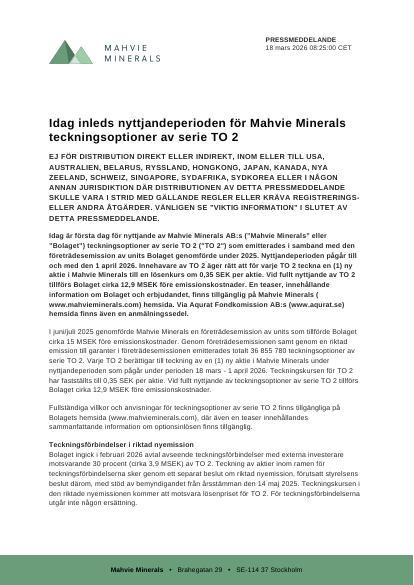 Idag är första dag för nyttjande av Mahvie Minerals AB:s (”Mahvie Minerals” eller ”Bolaget”) teckningsoptioner av serie TO 2 ("TO 2") som emitterades i samband med den företrädesemission av units Bolaget genomförde under 2025. Nyttjandeperioden pågår till och med den 1 april 2026. Innehavare av TO 2 äger rätt att för varje TO 2 teckna en (1) ny aktie i Mahvie Minerals till en lösenkurs om 0,35 SEK per aktie. Vid fullt nyttjande av TO 2 tillförs Bolaget cirka 12,9 MSEK före emissionskostnader. En teaser, innehållande information om Bolaget och erbjudandet, finns tillgänglig på Mahvie Minerals (www.mahvieminerals.com) hemsida. Via Aqurat Fondkomission AB:s (www.aqurat.se) hemsida finns även en anmälningssedel.