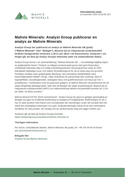 Analyst Group skriver i sin sammanfattning: "Mahvie Minerals AB … huvudsakliga tillgång utgörs av guldprojektet Haveri i Finland, en tidigare producerande gruva med god infrastruktur, omfattande historiska data och tydlig utvecklingspotential. Borrprogrammet under år 2025 bekräftade höghaltiga zoner och stärker förutsättningarna för att ta nästa steg mot gruvdrift. Portföljen omfattar även guldprojektet Åkerberg i det mineralrika Skelleftefältet samt basmetallprojektet Mofjell i Norge, vilket utvärderas för partnerskap eller avyttring. Med en kapitaleffektiv utvecklingsmodell, strategiskt fokus mot guldförekomster och fokus på Tier 1-jurisdiktioner, i kombination med ett gynnsamt guldpris, är Mahvie Minerals väl positionerat för att skapa långsiktigt aktieägarvärde i takt med att Bolaget når högre projektmognad. Baserat på en riskjusterad nuvärdesmodell (rNPV) och relativvärdering härleds ett potentiellt nuvärde om 1,3 kr per aktie i ett Base scenario."