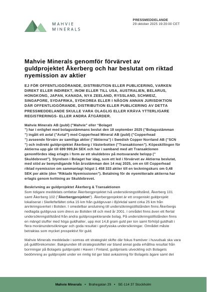 Mahvie Minerals AB (publ) ("Mahvie" eller "Bolaget") har i enlighet med bolagsstämmans beslut den 18 september 2025 ("Bolagsstämman") ingått ett avtal ("Avtal") med Copperhead Mineral AB (publ) ("Copperhead") avseende förvärv av samtliga aktier ("Aktierna") i Swedish Copper Norrland AB ("SCN") och indirekt guldprojektet Åkerberg i Västerbotten ("Transaktionen"). Köpeskillingen för Aktierna upp går till 699 999,84 SEK och har i samband med att Transaktionen genomfördes idag erlagts i form av ett skuldebrev på motsvarande belopp ("Skuldebrevet"). Styrelsen i Bolaget har idag, som ett led i förvärvet av Aktierna beslutat, med stöd av bemyndigande från årsstämman den 14 maj 2025, om en till Copperhead riktad nyemission om sammanlagt högst 1 458 333 aktier till en teckningskurs om 0,48 SEK per aktie (den "Riktade Nyemissionen"). Betalning för de nyemitterade aktierna har erlagts genom kvittning av Skuldebrevet.
