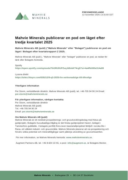 Mahvie Minerals AB (publ.), "Mahvie Minerals" eller "bolaget" publicerar en pod, se nedan för länk eller Bolagets hemsida.