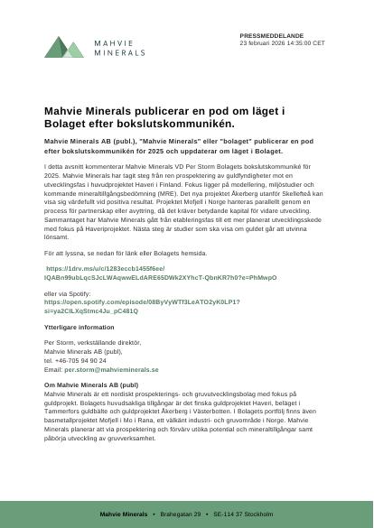 Mahvie Minerals AB (publ.), "Mahvie Minerals" eller "bolaget" publicerar en pod efter bokslutskommunikén för 2025 och uppdaterar om läget i Bolaget.