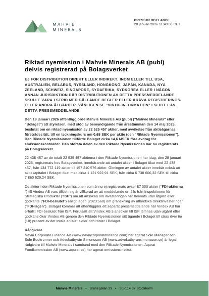 Den 19 januari 2026 offentliggjorde Mahvie Minerals AB (publ) ("Mahvie Minerals" eller "Bolaget") att styrelsen, med stöd av bemyndigande från årsstämman den 14 maj 2025, beslutat om en riktad nyemission av 22 525 457 aktier, med avvikelse från aktieägarnas företrädesrätt, till en teckningskurs om 0,65 SEK per aktie (den "Riktade Nyemissionen"). Den Riktade Nyemissionen tillförde Bolaget cirka 14,6 MSEK före avdrag för emissionskostnader. Den största delen av den Riktade Nyemissionen har nu registrerats på Bolagsverket.