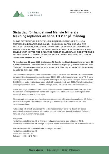På måndag, den 30 mars 2026, är sista dag för handel med teckningsoptioner av serie TO 2, som emitterades i samband med Mahvie Minerals AB (publ):s (”Mahvie Minerals” eller ”Bolaget”) företrädesemission av units under 2025. Sista dag att nyttja TO 2 för teckning av aktier är den 1 april 2026.