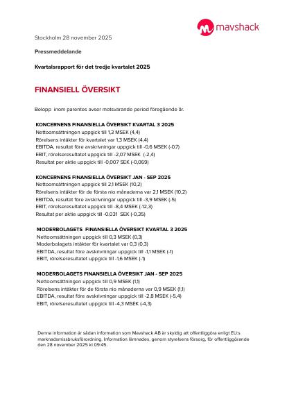 Denna information är sådan information som Mavshack AB är skyldig att offentliggöra enligt EU:s marknadsmissbruksförordning. Information lämnades, genom styrelsens försorg, för offentliggörande den 28 november 2025 kl 09:45.