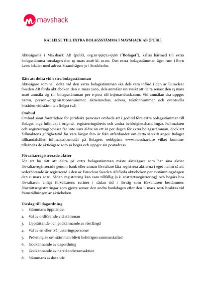 Aktieägarna i Mavshack AB (publ), org.nr 556721-5388 ("Bolaget"), kallas härmed till extra bolagsstämma torsdagen den 19 mars 2026 kl. 10.00. Den extra bolagsstämman äger rum i Born Laws lokaler med adress Strandvägen 7a i Stockholm.