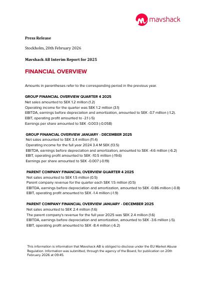 This information is information that Mavshack AB is obliged to disclose under the EU Market Abuse Regulation. Information was submitted, through the agency of the Board, for publication on 20th February 2026 at 09:45.