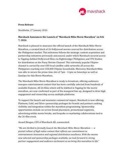 "We are thrilled to formally launch the Mavshack Milio Movie Marathon - a pivotal rollout of high-value content that reflects our commitment to entertainment innovation and regional distribution excellence. With the movies now selected and sponsorship packages available, we look forward to strong partner engagement and audience excitement as we bring this marathon to life."