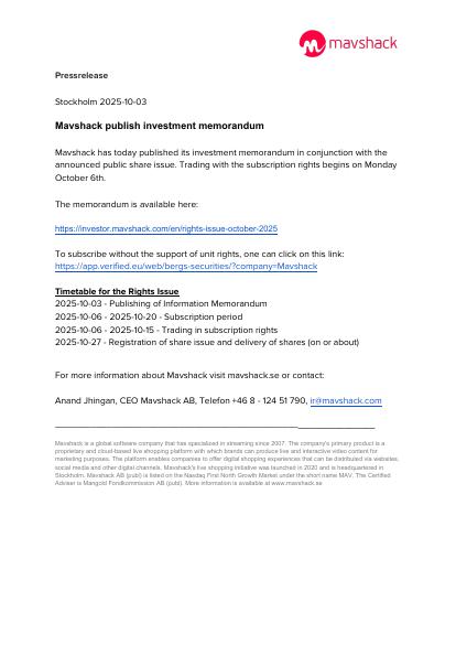 Mavshack has today published its investment memorandum in conjunction with the announced public share issue. Trading with the subscription rights begins on Monday October 6th.