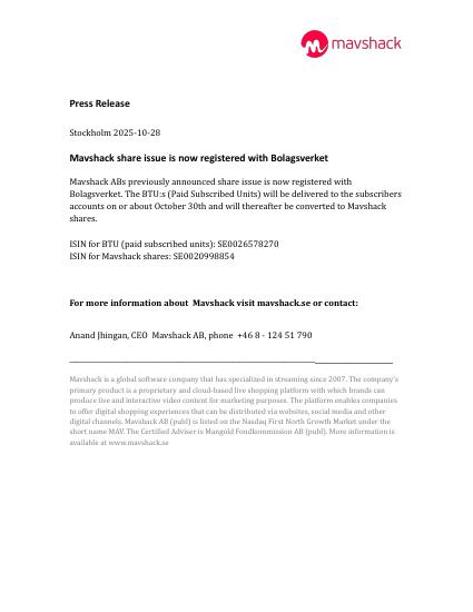 Mavshack ABs previously announced share issue is now registered with Bolagsverket. The BTU:s (Paid Subscribed Units) will be delivered to the subscribers accounts on or about October 30th and will thereafter be converted to Mavshack shares.