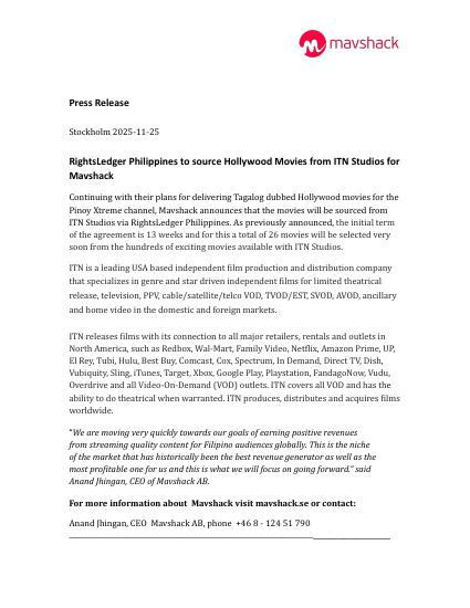 "We are moving very quickly towards our goals of earning positive revenues from streaming quality content for Filipino audiences globally. This is the niche of the market that has historically been the best revenue generator as well as the most profitable one for us and this is what we will focus on going forward." said Anand Jhingan, CEO of Mavshack AB.