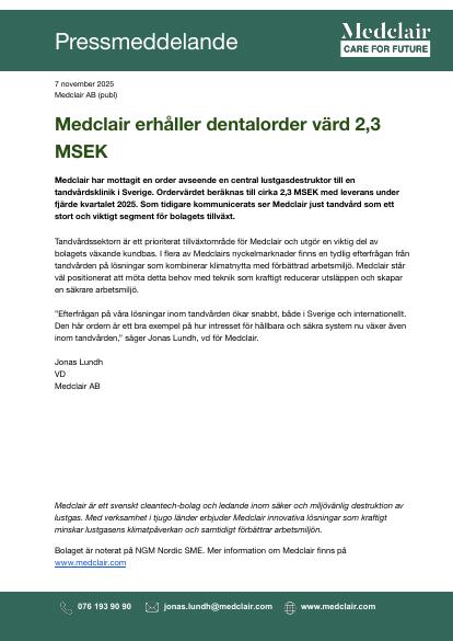 Medclair har mottagit en order avseende en central lustgasdestruktor till en tandvårdsklinik i Sverige. Ordervärdet beräknas till cirka 2,3 MSEK med leverans under fjärde kvartalet 2025. Som tidigare kommunicerats ser Medclair just tandvård som ett stort och viktigt segment för bolagets tillväxt.