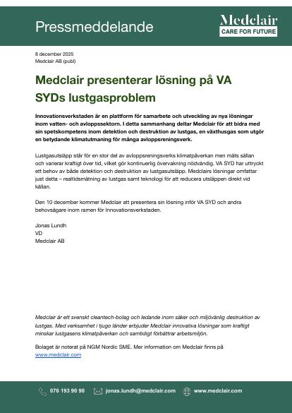 Lustgasutsläpp står för en stor del av avloppsreningsverks klimatpåverkan men mäts sällan och varierar kraftigt över tid, vilket gör kontinuerlig övervakning nödvändig. VA SYD har uttryckt ett behov av både detektion och destruktion av lustgasutsläpp. Medclairs lösningar omfattar just detta - realtidsmätning av lustgas samt teknologi för att reducera utsläppen direkt vid källan.