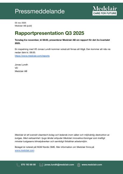 Torsdag 6:e november, kl 08:00, presenterar Medclair AB sin rapport för det 3:e kvartalet 2025.