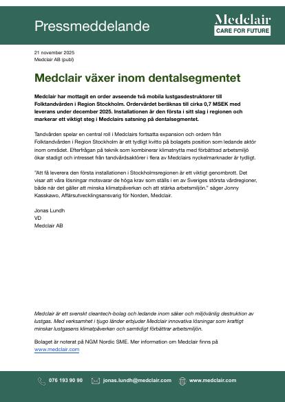 Medclair har mottagit en order avseende två mobila lustgasdestruktorer till Folktandvården i Region Stockholm. Ordervärdet beräknas till cirka 0,7 MSEK med leverans under december 2025. Installationen är den första i sitt slag i regionen och markerar ett viktigt steg i Medclairs satsning på dentalsegmentet.