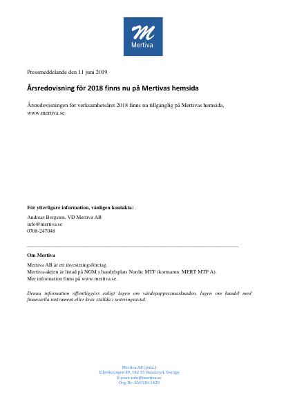Årsredovisningen för verksamhetsåret 2018 finns nu tillgänglig på Mertivas hemsida, www.mertiva.se.