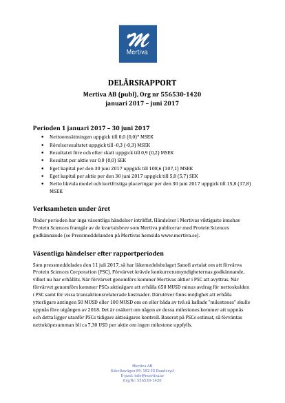 Som pressmeddelades den 11 juli 2017, så har läkemedelsbolaget Sanofi avtalat om att förvärva Protein Sciences Corporation (PSC). Förvärvet krävde konkurrensmyndigheternas godkännande, vilket nu har erhållits. När förvärvet genomförs kommer Mertivas aktier i PSC att avyttras. När förvärvet genomförs kommer PSCs aktieägare att erhålla 650 MUSD minus avdrag för nettoskulden i PSC samt för vissa transaktionsrelaterade kostnader. Därutöver finns möjlighet att erhålla ytterligare antingen 50 MUSD eller 100 MUSD om en eller båda av två så kallade "milestones" skulle uppnås före utgången av 2018. Det är osäkert om någon av dessa milestones kommer att uppnås och detta ligger utanför PSCs tidigare aktieägares kontroll. Baserat på PSCs estimat, så förväntas nettoköpesumman bli ca 7,30 USD per aktie om ingen milestone uppfylls.