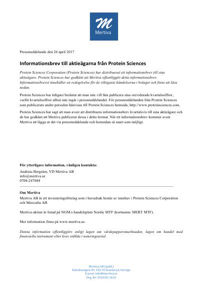 Protein Sciences har sagt att man avser att distribuera informationsbrev kvartalsvis till sina aktieägare och de har godkänt att Mertiva publicerar dessa i detta format. När ett informationsbrev kommer avser Mertiva att lägga ut det via pressmeddelande och hemsidan så snart som möjligt.