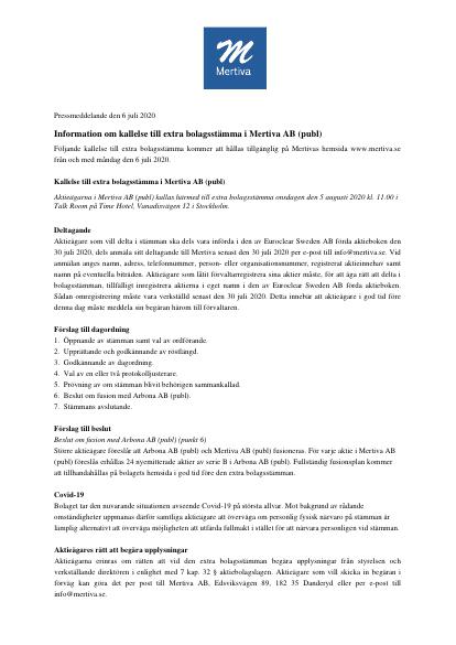 Följande kallelse till extra bolagsstämma kommer att hållas tillgänglig på Mertivas hemsida www.mertiva.se från och med måndag den 6 juli 2020.