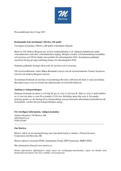 Mertivas VD Andreas Bergsten gav en kort sammanfattning av de viktigaste händelserna under verksamhetsåret samt efter verksamhetsårets utgång. Bolagets resultat- och balansräkning fastställdes och styrelsen och VD beviljades ansvarsfrihet för räkenskapsåret 2016. Årsstämman godkände styrelsens förslag att ingen utdelning lämnas för räkenskapsåret 2016.
