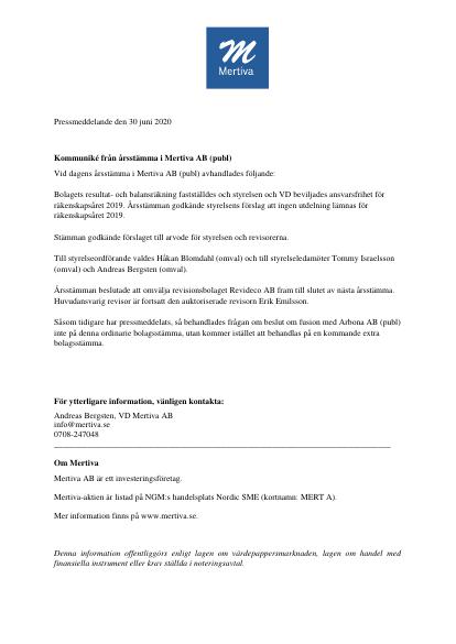 Kommuniké från årsstämma i Mertiva AB (publ)