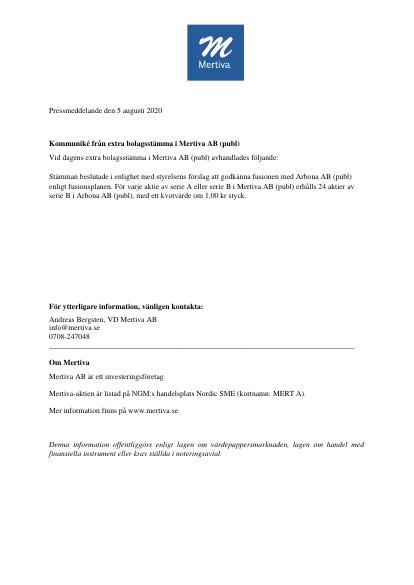 Stämman beslutade i enlighet med styrelsens förslag att godkänna fusionen med Arbona AB (publ) enligt fusionsplanen. För varje aktie av serie A eller serie B i Mertiva AB (publ) erhålls 24 aktier av serie B i Arbona AB (publ), med ett kvotvärde om 1,00 kr styck.
