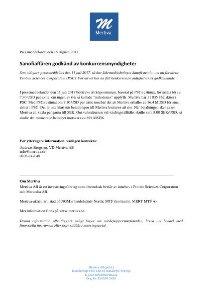 Som tidigare pressmeddelats den 11 juli 2017, så har läkemedelsbolaget Sanofi avtalat om att förvärva Protein Sciences Corporation (PSC). Förvärvet har nu fått konkurrensmyndigheternas godkännande.