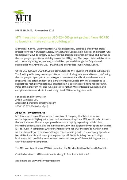 Mombasa, Kenya. MTI Investment AB has successfully secured a three year grant project from the Norwegian Agency for Exchange Cooperation (Norec). The project runs from January 2026 to January 2029, ensuring predictable funding inflows and increases the company's operational stability across the MTI group. The project is in collaboration with University of Agder, Norway, and will be operated through the fully-owned subsidiaries MTI Advisory Ltd, Tanzania, and TechBridge Invest Africa, Kenya.