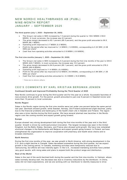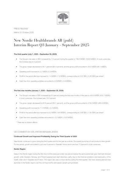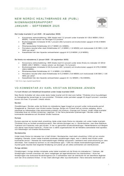 The information in this press release is the information that New Nordic Healthbrands AB (publ) is obliged to make public pursuant to the EU Market Abuse Regulation. The information was submitted for publication, through the agency of the contact person set out above, on October 31, 2025, at 8:00 a.m. (CET).