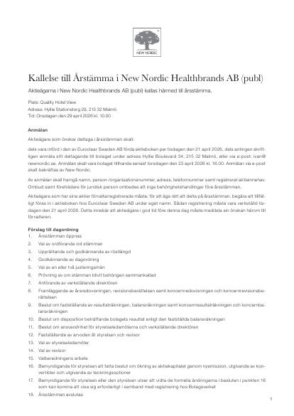 Aktieägarna i New Nordic Healthbrands AB (publ) kallas härmed till årsstämma.