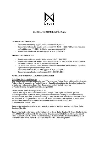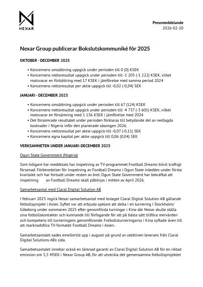 Denna information är sådan information som Nexar Group AB (publ) är skyldigt att offentliggöra enligt EU:s marknadsmissbruksförordning. Informationen lämnades, genom nedanstående kontaktpersons försorg, för offentliggörande den 20 februari 2026. För mer information, besök www.nexargroup.se, eller kontakta: