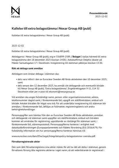 Aktieägarna i Nexar Group AB (publ), org.nr 556899-2589, ("Bolaget") kallas härmed till extra bolagsstämma den 18 december 2025 klockan 14:00, i Advokatfirman Delphis lokaler på Mäster Samuelsgatan 17 i Stockholm. Inregistrering till stämman påbörjas klockan 13:30.