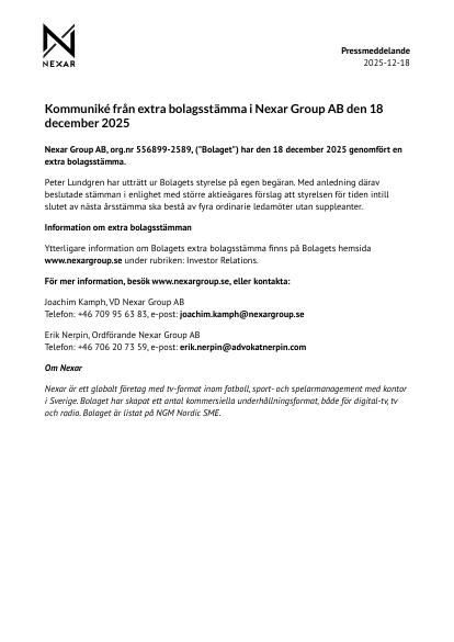 Nexar Group AB, org.nr 556899-2589, ("Bolaget") har den 18 december 2025 genomfört en extra bolagsstämma.
