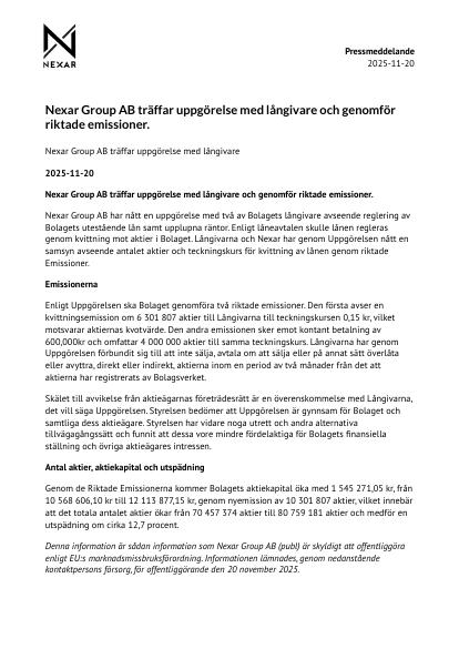 Nexar Group AB träffar uppgörelse med långivare och genomför riktade emissioner.