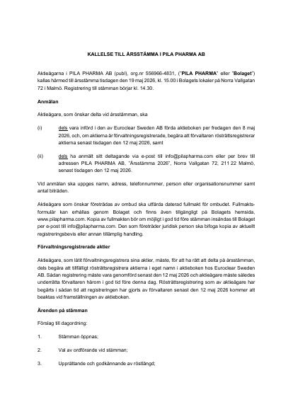 Aktieägarna i PILA PHARMA AB (publ), org.nr 556966-4831, ("PILA PHARMA" eller "Bolaget") kallas härmed till årsstämma tisdagen den 19 maj 2026, kl. 15.00 i Bolagets lokaler på Norra Vallgatan 72 i Malmö. Registrering till stämman börjar kl. 14.30.
