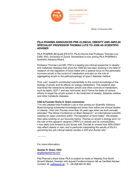 PILA PHARMA AB (publ) (FN STO: PILA) informs that Professor Thomas Lutz DVM, PhD, University of Zurich, Switzerland is now joining PILA PHARMA's Scientific Advisory Board.