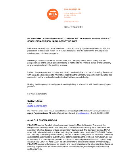 PILA PHARMA AB (publ) ("PILA PHARMA" or the "Company") yesterday announced that the publication of the annual report for the 2025 fiscal year and the date for the annual general meeting have both been postponed.