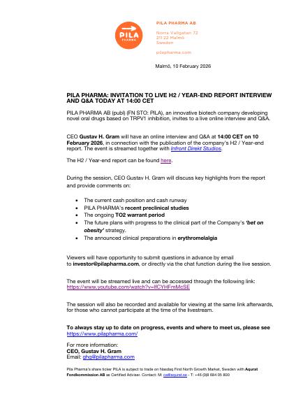 PILA PHARMA AB (publ) (FN STO: PILA), an innovative biotech company developing novel oral drugs based on TRPV1 inhibition, invites to a live online interview and Q&A.
