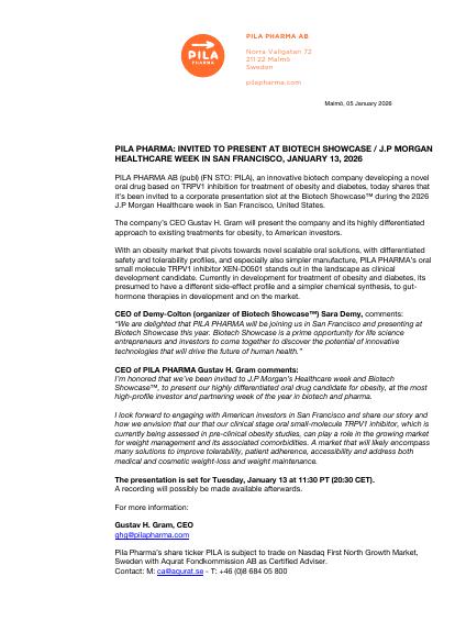 PILA PHARMA AB (publ) (FN STO: PILA), an innovative biotech company developing a novel oral drug based on TRPV1 inhibition for treatment of obesity and diabetes, today shares that it's been invited to a corporate presentation slot at the Biotech Showcase™ during the 2026 J.P Morgan Healthcare week in San Francisco, United States.